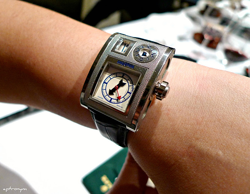 And a final tableshot, including the edible interloper, a pocket watch from flour and stone. Embarassingly, I was so distracted by the horological overload that there were watches that I didn't get to photograph individually, but you can see some of them at this link.